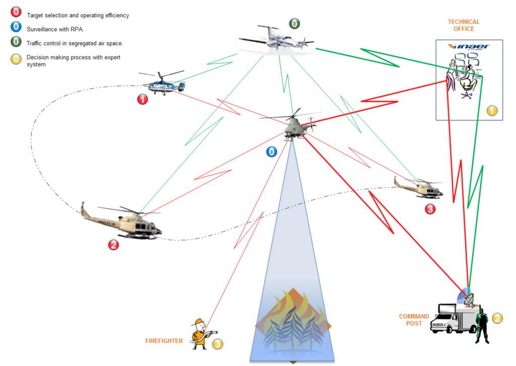 The objective of the project is to develop a new service for Emergency Critical Missions (onshore and offshore), enabling manned and unmanned aircraft to operate in the same airspace in a cooperative and secure manner. Unmanned aircraft will carry out observation tasks (e.g. search, detection, recognition) to support the decision making process (e.g. evaluation) and manned aircraft will handle the intervention tasks (e.g. firefight, evacuation…).